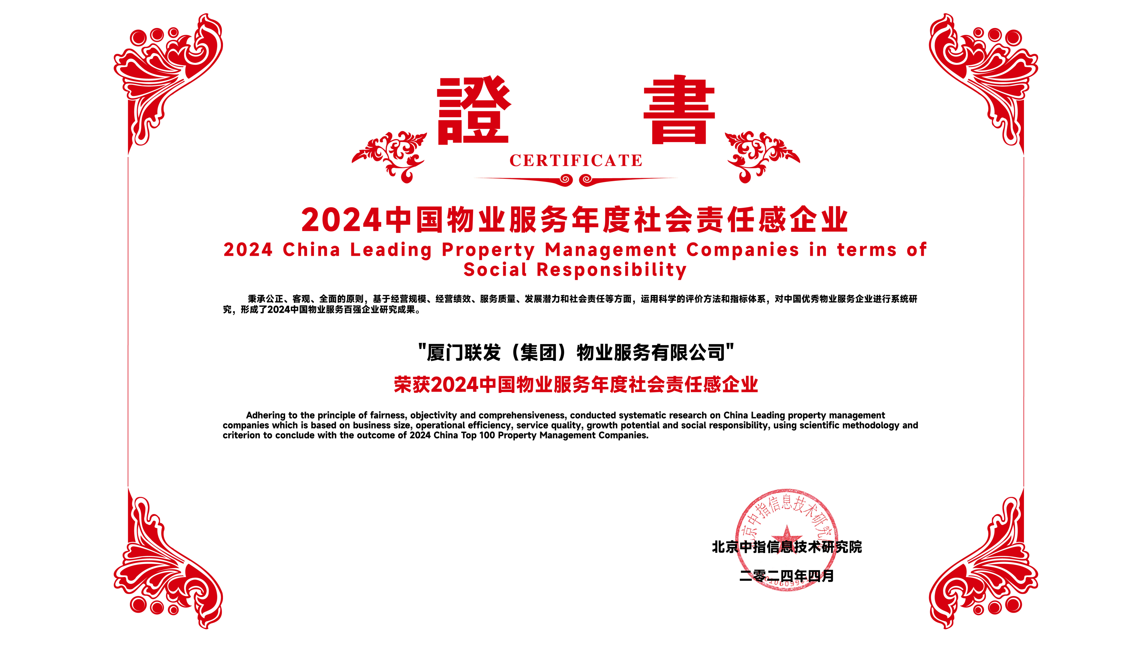 Recently, the China Index Academy released the "2024 China Top 100 Property Service Enterprises Research Results," awarding Lianfa Property the title for the 15th consecutive year. In 2024, Lianfa Property ranked 25th and also received awards for "2024 China Property Service Corporate Social Responsibility" and "2024 China Property Service Satisfaction Leader.” Lianfa Property consistently places customers at the core of its operations, enhancing the quality of foundational services and extending the boundaries of urban services, all aimed at building a better new life.